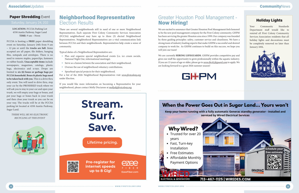 Your Community Standards Department staff would like to remind all First Colony Community Services Association residents that all holiday lights and decorations must be completely removed no later than January 10th.