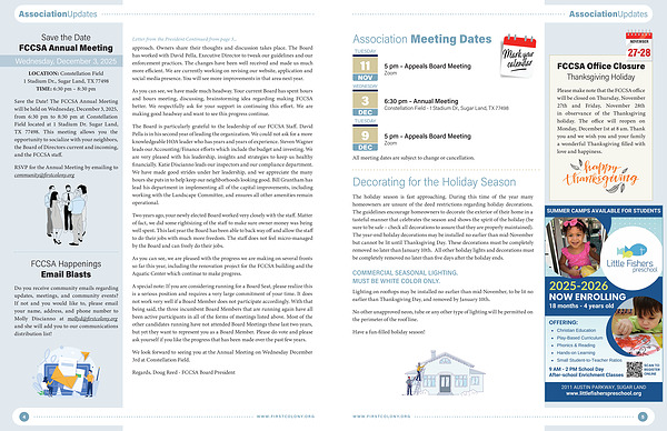 Save the Date! The FCCSA Annual Meeting will be held on Wednesday, December 3, 2025, from 6:30 pm to 8:30 pm at Constellation Field located at 1 Stadium Dr. Sugar Land, TX 77498. This meeting allows you the opportunity to socialize with your neighbors, the Board of Directors current and incoming, and the FCCSA staff.