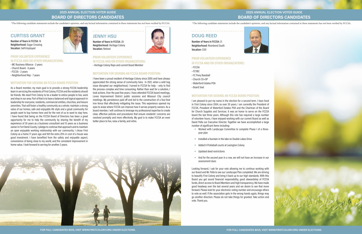 Looking forward, I ask for your vote allowing me to continue working with our Board and Mr. Pella to see our Landscape Plan completed. We are striving to beautify First Colony and bring it back up to our high standards. With this Board you get sound financial responsibility, good stewardship of FCCSA funds, direct access to Board Members and high transparency. We have made good headway over the last several years and we desire to see that move forward. Please look for your electronic voting number and encourage others to vote as well. If the association gets in the wrong hands again, things may go another direction. Please do not take things for granted. Take action and vote. Thank you.