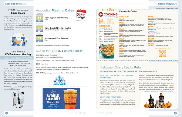 Save the Date! The FCCSA Annual Meeting will be held on Wednesday, December 3, 2025, from 6:30 pm to 8:30 pm at Constellation Field located at 1 Stadium Dr. Sugar Land, TX 77498. This meeting allows you the opportunity to socialize with your neighbors, the Board of Directors current and incoming, and the FCCSA staff.
