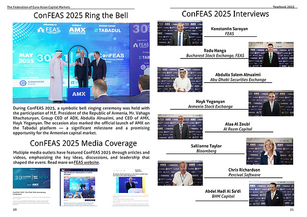 During ConFEAS 2025, a symbolic bell ringing ceremony was held with the participation of H.E. President of the Republic of Armenia, Mr. Vahagn Khachaturyan, Group CEO of ADX, Abdulla Alnuaimi, and CEO of AMX, Hayk Yeganyan. The occasion also marked the official launch of AMX on the Tabadul platform — a significant milestone and a promising opportunity for the Armenian capital market.