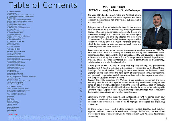 This year marked an important milestone in our journey. FEAS celebrated its 30th anniversary, reflecting on three decades of cooperation across an increasingly diverse and interconnected region. At the same time, 2025 was a year of transformation. We officially adopted the new name Federation of Euro-Asian Capital Markets, together with a refreshed identity and the slogan “FEASible diversity”, which better captures both our geographical reach and the strength derived from diversity.