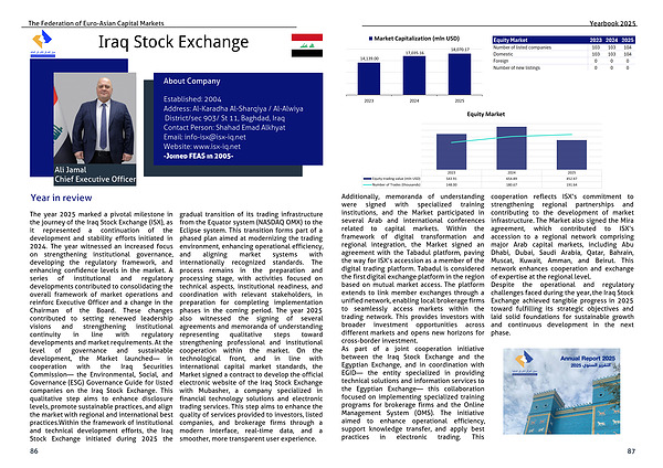 The year 2025 marked a pivotal milestone in the journey of the Iraq Stock Exchange (ISX), as it represented a continuation of the development and stability efforts initiated in 2024. The year witnessed an increased focus on strengthening institutional governance, developing the regulatory framework, and enhancing confidence levels in the market. A series of institutional and regulatory developments contributed to consolidating the overall framework of market operations and reinforc Executive Officer and a change in the Chairman of the Board. These changes contributed to setting renewed leadership visions and strengthening institutional continuity in line with regulatory developments and market requirements. At the level of governance and sustainable development, the Market launched— in cooperation with the Iraq Securities Commission— the Environmental, Social, and Governance (ESG) Governance Guide for listed companies on the Iraq Stock Exchange. This qualitative step aims to enhance disclosure levels, promote sustainable practices, and align the market with regional and international best practices.Within the framework of institutional and technical development efforts, the Iraq Stock Exchange initiated during 2025 the gradual transition of its trading infrastructure from the Equator system (NASDAQ OMX) to the Eclipse system. This transition forms part of a phased plan aimed at modernizing the trading environment, enhancing operational efficiency, and aligning market systems with internationally recognized standards. The process remains in the preparation and processing stage, with activities focused on technical aspects, institutional readiness, and coordination with relevant stakeholders, in preparation for completing implementation phases in the coming period. The year 2025 also witnessed the signing of several agreements and memoranda of understanding representing qualitative steps toward strengthening professional and institutional cooperation within the market. On the technological front, and in line with international capital market standards, the Market signed a contract to develop the official electronic website of the Iraq Stock Exchange with Mubasher, a company specialized in financial technology solutions and electronic trading services. This step aims to enhance the quality of services provided to investors, listed companies, and brokerage firms through a modern interface, real-time data, and a smoother, more transparent user experience.