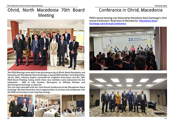 The FEAS Meetings were held in the picturesque city of Ohrid, North Macedonia, and hosted by the Macedonian Stock Exchange, a valued FEAS member. From September 18–19, 2024, industry leaders convened for insightful discussions and the 70th FEAS Board Meeting, during which three new members were welcomed into the Federation - ADX as Full member, Devexperts as Affiliate Member and Asia-European Exchange as observer.