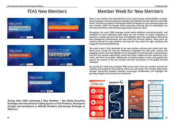 During 2024 FEAS welcomed 5 New Members - Abu Dhabi Securities Exchange and International Trading System as Full Members, Devexperts Georgia and swissQuant as Affiliate Members, Asia-Europe Exchange as Observer.