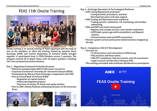 Onsite training is an annual training of FEAS organized with the help of one of the members. In 2024 the training, hosted by Armenia Stock Exchange (AMX) and Central Depository of Armenia (CDA), brought together 17 participants from 11 FEAS Members across 7 countries. The program covered 18 in-depth topics with 20 expert speakers, including site visits and practical demonstrations.