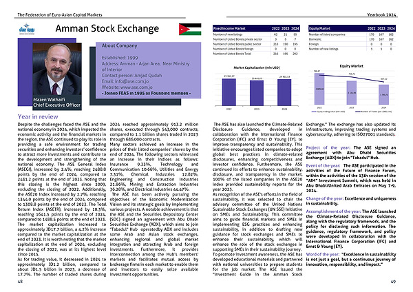 As recognition of the ASE's efforts in the field of sustainability, it was selected to chair the advisory committee of the United Nations Sustainable Stock Exchanges (UN SSE) Initiative on SMEs and Sustainability. This committee aims to guide financial markets and SMEs in implementing ESG practices and enhancing sustainability, in addition to drafting new guidance for stock exchanges and SMEs to enhance their sustainability, which will enhance the role of the stock exchanges in supporting SMEs in their sustainability journey.