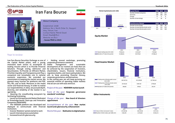 Iran Fara Bourse Securities Exchange as one of the Capital Market pillars, with a young, motivated team strives to accomplish its leading mission which is to Provide Financial Solutions Through Listing, Admission and Securitization, To Provide an Efficient Market, Prioritize Liquidity and Transparency and Play a competent and remarkable role in national economic expansions. We extended our commitment to keeping the market secure. We granted many licenses for platforms and FOF, VCs, PEs, and so forth. Moreover, in the media sector and financial literacy. In order to realize our responsibilities, in 2024, we pursued depth, diversity, and reliability of the market in our agenda by: