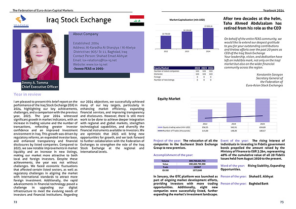 I am pleased to present this brief report on the performance of the Iraq Stock Exchange (ISX) in 2024, highlighting our key achievements, challenges, and a comparison with the previous year, 2023. The year 2024 witnessed significant growth in market indicators, with an increase in trading volume and the number of transactions, reflecting greater investor confidence and an improved investment environment in Iraq. This growth was driven by regulatory reforms, an expanded investor base, and enhanced transparency and financial disclosures by listed companies. Compared to 2023, we saw notable improvements in market liquidity and an increase in new listings, making our market more attractive to both local and foreign investors. Despite these achievements, the year was not without challenges. We faced economic fluctuations that affected certain listed sectors, as well as regulatory challenges in aligning the market with international standards to attract more foreign investment. Additionally, the rapid advancements in financial technology posed a challenge in upgrading our digital infrastructure to meet the evolving needs of investors and financial institutions. Regarding our 2024 objectives, we successfully achieved many of our key targets, particularly in enhancing market efficiency, expanding financial services, and improving transparency and disclosures. However, there is still more work to be done to achieve deeper integration with regional and global markets, strengthen technological capabilities, and diversify the financial instruments available to investors. We are optimistic that 2025 will bring new opportunities for growth, and we look forward to further collaboration with the Federation of Exchanges to strengthen the role of the Iraq Stock Exchange at the regional and international levels.