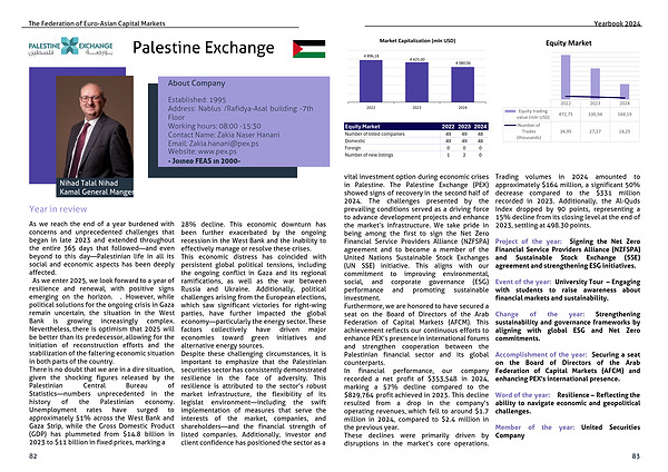 vital investment option during economic crises in Palestine. The Palestine Exchange (PEX) showed signs of recovery in the second half of 2024. The challenges presented by the prevailing conditions served as a driving force to advance development projects and enhance the market’s infrastructure. We take pride in being among the first to sign the Net Zero Financial Service Providers Alliance (NZFSPA) agreement and to become a member of the United Nations Sustainable Stock Exchanges (UN SSE) initiative. This aligns with our commitment to improving environmental, social, and corporate governance (ESG) performance and promoting sustainable investment.