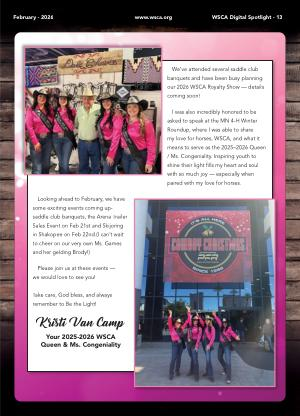 We’ ve attended several saddle club banquets and have been busy planning our 2026 WSCA Royalty Show— details coming soon!