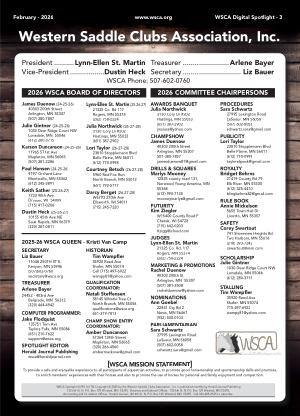WSCA Spotlight( USPS 16178) Copyright © 2025 by the Western Saddle Clubs Association., Inc. is published monthly by Herald Journal Publishing 120 6th St. N. P. O. Box 129 Winsted, MN 55395. Business and Editorial Offices: 120 6th St. N P. O. Box 129 Winsted, MN 55395, Accounting and Circulation Offices: Herald Journal, 120 6th St. N. P. O. Box 129, Winsted, MN 55395. Call 320-485-2535 to subscribe.