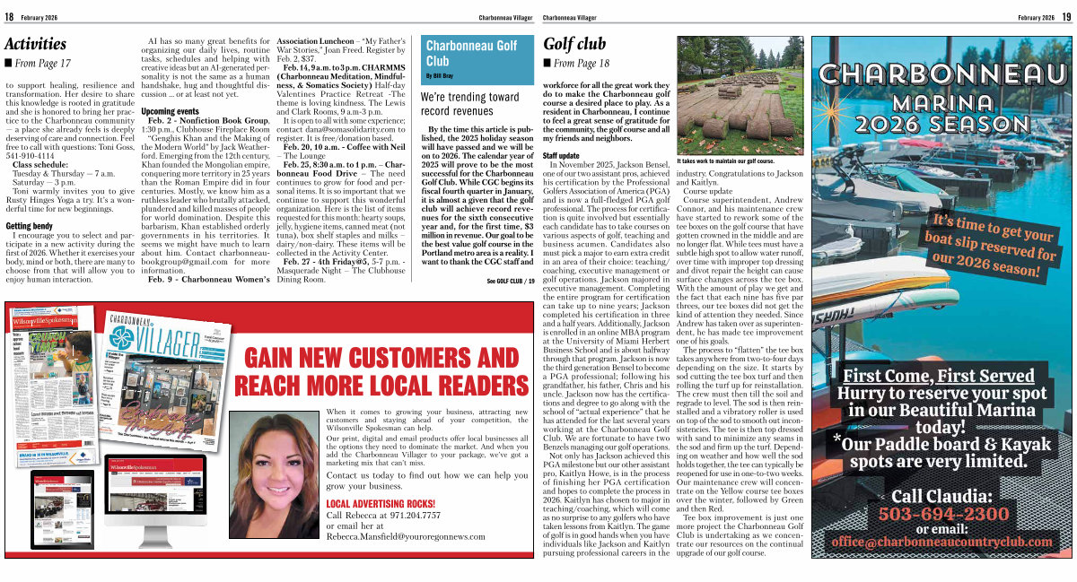 We’ re trending toward record revenues By the time this article is published, the 2025 holiday season will have passed and we will be on to 2026. The calendar year of 2025 will prove to be the most successful for the Charbonneau Golf Club. While CGC begins its fiscal fourth quarter in January, it is almost a given that the golf club will achieve record revenues for the sixth consecutive year and, for the first time, $ 3 million in revenue. Our goal to be the best value golf course in the Portland metro area is a reality. I want to thank the CGC staff and