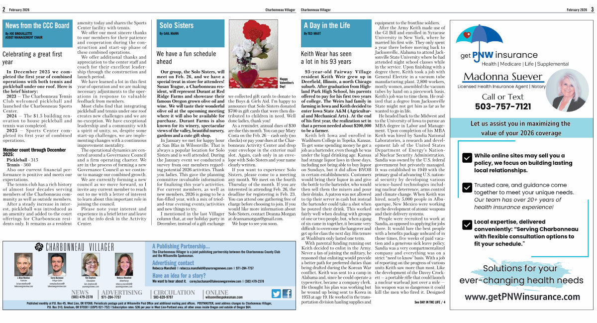 We have a fun schedule ahead Our group, the Solo Sisters, will meet on Feb. 26, and we have a special treat in store for attendees! Susan Teague, a Charbonneau resident, will represent Durant at Red Ridge Farms and showcase their famous Oregon grown olive oil and wine. We will taste their wonderful olive oil at the upcoming meeting where it will also be available for purchase. Durant Farms is also known for its winery, spectacular views of the valley, beautiful nursery, gardens and a cute gift shop.