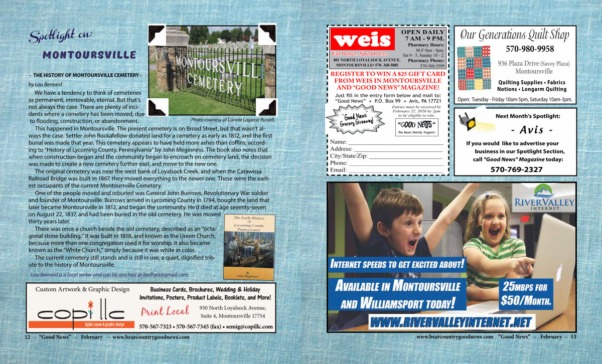 REGISTER TO WIN A $ 25 GIFT CARD FROM WEIS IN MONTOURSVILLE AND“ GOOD NEWS” MAGAZINE!