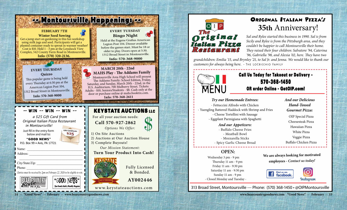 313 Broad Street, Montoursville--- Phone:( 570) 368-1450 • @ OIPMontoursville www. bearcountrygoodnews. com“ Good News”-- February-- 15