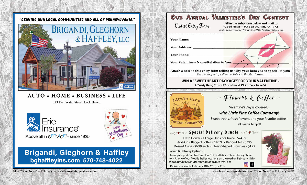Fill in the entry form below and mail to: " Good News "- PO Box 99, Avis, PA 17721 Entries must be received by February 13, 2026 by 2pm to be eligible to win.