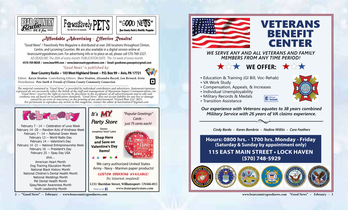 " Good News " / Pawsitively Pets Magazine is distributed at over 200 locations throughout Clinton, Centre, and Lycoming Counties. We are also available in a digital version online at bearcountrygoodnews. com. For advertising info or to place an ad, please call 570-769-2327. AD DEADLINE: The 20th of every month. PUBLICATION DATE: The 1st week of every month.
