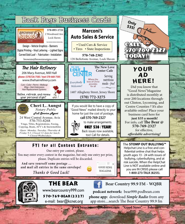 Did you know that“ Good News” Magazine is distributed monthly at over 200 locations throughout Clinton, Lycoming, and Centre Counties? It’ s also available online! Place your business card here for just $ 35 a month! For info, call The Bear @ 570-769-2327