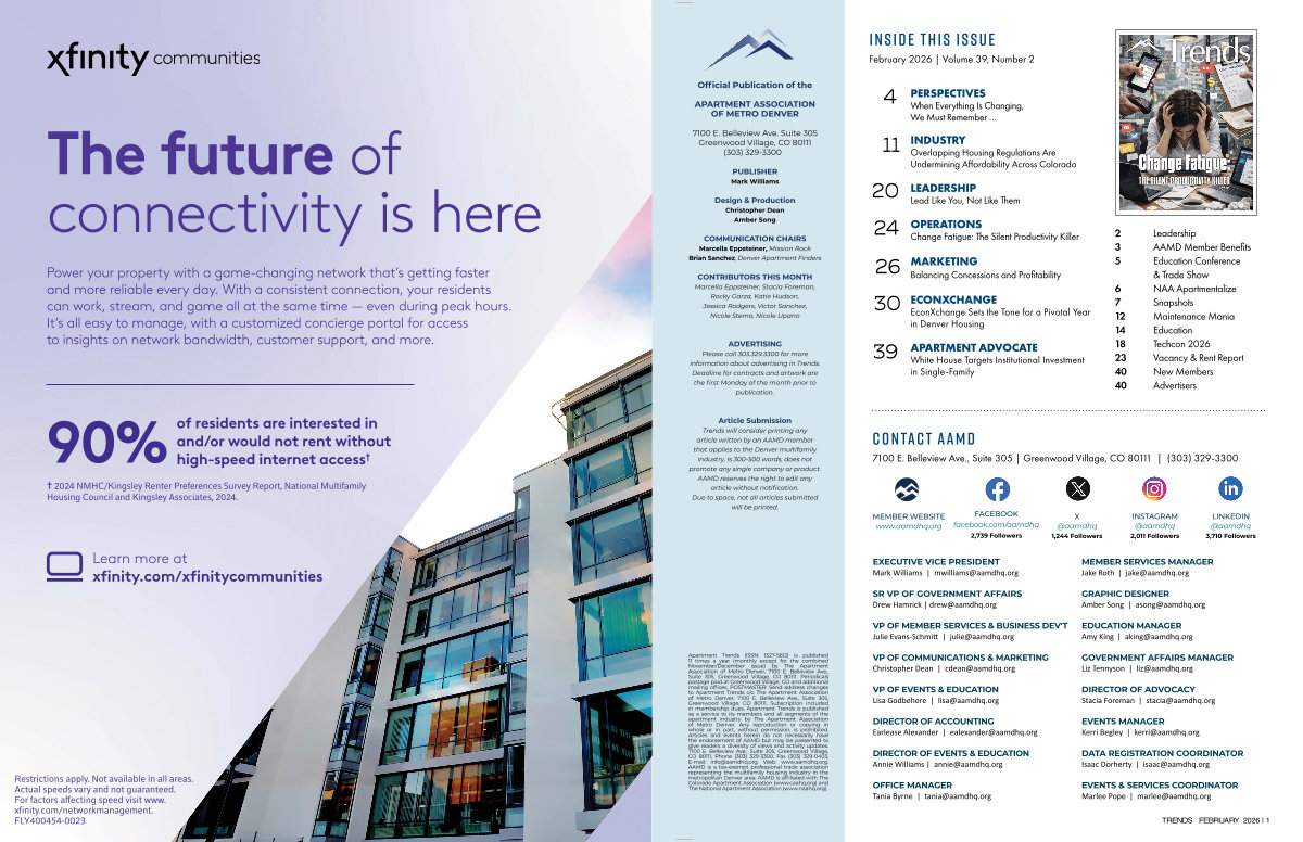 Apartment Trends( ISSN: 1527-5612) is published 11 times a year( monthly except for the combined November / December issue) by The Apartment Association of Metro Denver, 7100 E. Belleview Ave., Suite 305, Greenwood Village, CO 80111. Periodicals postage paid at Greenwood Village, CO and additional mailing offices. POSTMASTER: Send address changes to Apartment Trends c / o The Apartment Association of Metro Denver, 7100 E. Belleview Ave., Suite 305, Greenwood Village, CO 80111. Subscription included in membership dues. Apartment Trends is published as a service to its members and all segments of the apartment industry by The Apartment Association of Metro Denver. Any reproduction or copying in whole or in part, without permission, is prohibited. Articles and events herein do not necessarily have the endorsement of AAMD but may be presented to give readers a diversity of views and activity updates. 7100 E. Belleview Ave., Suite 305, Greenwood Village, CO 80111, Phone( 303) 329-3300, Fax( 303) 329-0403, E-mail: info @ aamdhq. org, Web: www. aamdhq. org. AAMD is a tax-exempt professional trade association representing the multifamily housing industry in the metropolitan Denver area. AAMD is affiliated with The Colorado Apartment Association( www. caahq. org) and The National Apartment Association( www. naahq. org).