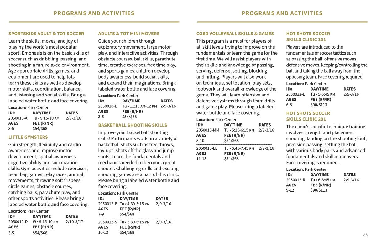 Gain strength , flexibility and cardio awareness and improve motor development , spatial awareness , cognitive ability and socialization skills . Gym activities include exercises , bean bag games , relay races , animal movements , throwing soft frisbees , circle games , obstacle courses , catching balls , parachute play , and other sports activities . Please bring a labeled water bottle and face covering .