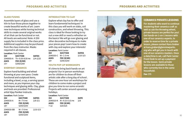 For students who want to continue mastering their ceramics craft as well as use the throwing wheel , private lessons are perfect for you ! Get hands-on 1-on-1 lessons with one of our ceramics experts . In order to reserve time for a private lesson , please contact Kara Graber at kara . graber @ glenviewparks . org who will get you in touch with one of our ceramics masters . Once a date / time is set , call Park Center Front Desk to set up a payment for the lesson . Semi-private lessons are available to those who currently live in the same household .