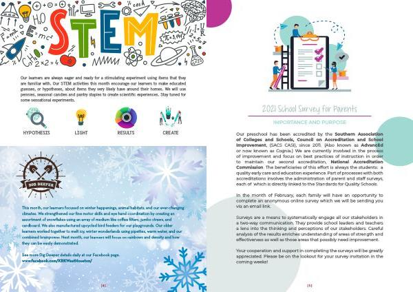 This month , our learners focused on winter happenings , animal habitats , and our ever-changing climates . We strengthened our fine motor skills and eye hand coordination by creating an assortment of snowflakes using an array of medium like coffee filters , jumbo straws , and cardboard . We also manufactured upcycled bird feeders for our playgrounds . Our older learners worked together to melt icy , winter wonderlands using pipettes , warm water , and our combined brainpower . Next month , our learners will focus on rainbows and density and how they can be easily demonstrated .