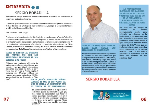 En el marco de las primarias del día 2 de julio, entrevistamos a Sergio Bobadilla, quien nos entregó su testimonio con respecto al triunfo del ex mandatario, y la ardua tarea que se aproxima para elecciones presidenciales del próximo 19 de noviembre del presente año, donde competirán, el candidato de Chile Vamos, expresidente Sebastián Piñera; del Frente Amplio, Beatriz Sánchez y los aspirantes de la Nueva Mayoría, Alejandro Guillier y Carolina Goic.