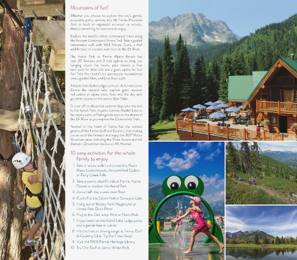 Mountains of fun! Whether you choose to explore the city’s gentle, accessible parks, venture into Mt Fernie Provincial. Park or book an organized excursion or activity, there’s something for everyone to enjoy. Explore the world’s oldest cottonwood trees along the Ancient Cottonwood Forest Trail. Take a guided. interpretive walk with Wild Nature Tours, a 4x4 wildlife tour, or a scenic river tour on the Elk River. The Aerial Park at Fernie Alpine Resort has over 20 features and 3 mini ziplines to keep you. hanging about for hours, plus there’s a free. mini-park for little kids and a giant zipline for fast fun! Take the chairlift for spectacular mountaintop views, guided hikes, and Lost Boys Cafe. A trip to Island Lake Lodge is a must-do for everyone.. Canoe the tranquil lake, explore giant western red cedars or alpine trails, then end the day with. gourmet cuisine on the scenic Bear Patio. To cool off on those hot summer days take the kids to the Splash Park, Aquatic Centre, Maiden Lake or Surveyors Lake, or find a gentle spot on the shores of the Elk River as you explore the Community Trails. Nestled in the heart of Fernie lies the verdant greens of the Fernie Golf and Country club inviting you to stroll the fairways and enjoy the 360º Rocky Mountain views including the Three Sisters and the dramatic Ghostrider shadow on Mt Hosmer. 10 easy activities for the whole. family to enjoy 1. Take a nature walk to discover the Giant . Black Cottonwoods, Ancient Red Cedars . or Fairy Creek Falls 2. Take a scenic chairlift ride at Fernie Alpine . Resort or explore the Aerial Park 3. Join a half-day scenic river float 4. Cool off at the Splash Park or Surveyors Lake 5. Hang out at Rotary Park Playground or. Annex Park Duck Pond 6. Play at the Dirt Jump Park or Skate Park 7. Enjoy lunch on the Island Lake Lodge patio. and a gentle hike or canoe 8. Hit the links or driving range at Fernie Golf . & Country Club. Try the 1 hour loop! 9. Visit the 1908 Fernie Heritage Library 10. Try Disc Golf at James White Park