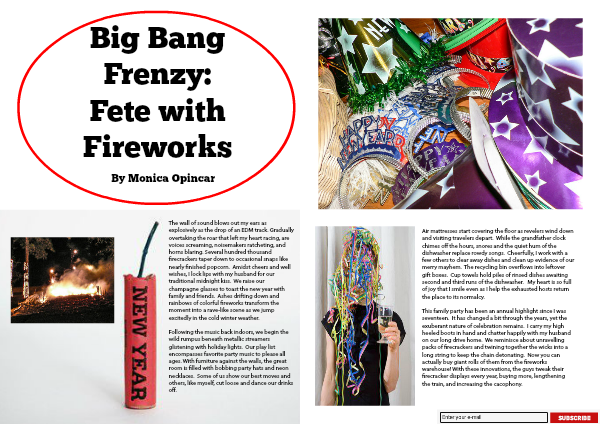 The wall of sound blows out my ears as explosively as the drop of an EDM track. Gradually overtaking the roar that left my heart racing, are voices screaming, noisemakers ratcheting, and horns blaring. Several hundred thousand firecrackers taper down to occasional snaps like nearly finished popcorn. Amidst cheers and well wishes, I lock lips with my husband for our traditional midnight kiss. We raise our champagne glasses to toast the new year with family and friends. Ashes drifting down and rainbows of colorful fireworks transform the moment into a rave-like scene as we jump excitedly in the cold winter weather.