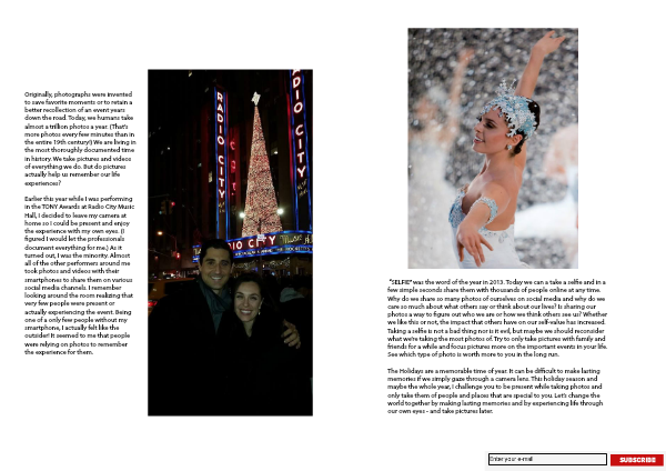 The Holidays are a memorable time of year. It can be difficult to make lasting memories if we simply gaze through a camera lens. This holiday season and maybe the whole year, I challenge you to be present while taking photos and only take them of people and places that are special to you. Let’s change the world together by making lasting memories and by experiencing life through our own eyes - and take pictures later.