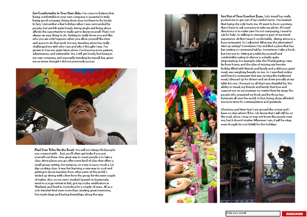 Find Your Tribe On the Road. You will not always find people you connect with ... but, you'll often get lucky if you put yourself out there. One great way to meet people is to take a class. Most places you go offer some kind of class that offers a small group setting. For instance, on a trip to Laos, I took a 1/2 day cooking class. It was fun learning a new way to cook and getting to know travelers from other parts of the world. I ended up dining with a few from the group for the next couple of nights. Also on my own I studied Spanish in Guatemala, went to a yoga retreat in Bali, got my scuba certification in Thailand, and lived in Costa Rica for a couple of years. All as a solo traveler! And even more than creating great memories, I’ve made deep and lasting friendships along the way.