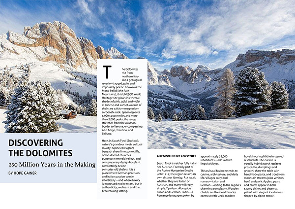 Here, in South Tyrol (Sudtirol), nature’s grandeur meets cultural duality. Alpine cows graze beneath sheer limestone cliffs, onion-domed churches punctuate emerald valleys, and contemporary design hotels sit comfortably beside centuries-old chalets. It is a place where German precision and Italian passion coexist effortlessly—and where luxury is expressed not in excess, but in authenticity, wellness, and the breathtaking setting.
