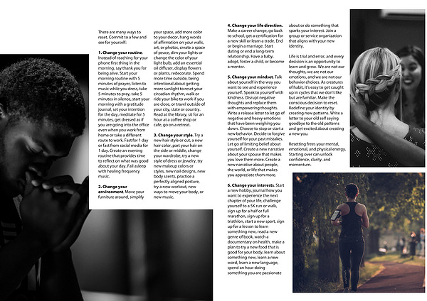 1. Change your routine. Instead of reaching for your phone first thing in the morning, say thank you for being alive. Start your morning routine with 5 minutes of prayer, listen to music while you dress, take 5 minutes to pray, take 5 minutes in silence, start your morning with a gratitude journal, set your intention for the day, meditate for 5 minutes, get dressed as if you are going into the office even when you work from home or take a different route to work. Fast for 1 day or fast from social media for 1 day. Create an evening routine that provides time to reflect on what was good about your day. Fall asleep with healing frequency music.