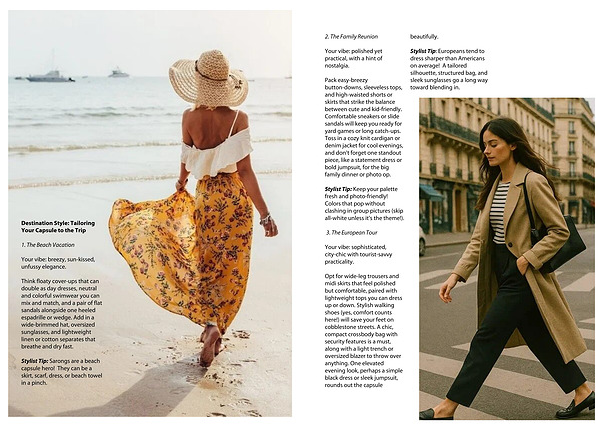 Think floaty cover-ups that can double as day dresses, neutral and colorful swimwear you can mix and match, and a pair of flat sandals alongside one heeled espadrille or wedge. Add in a wide-brimmed hat, oversized sunglasses, and lightweight linen or cotton separates that breathe and dry fast.