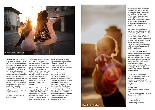 Choice is the thread that runs through every human experience. Remembering that we co-create from our power of choice allows us to own and write our narrative. No matter what happens in life, we can always choose how we interpret our experiences. We can choose growth over stagnation, courage over comfort, presence over distraction.