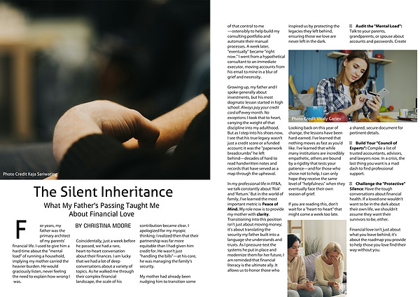 In my professional life in FP&A, we talk constantly about 'Risk' and 'Return.' But in the world of family, I’ve learned the most important metric is Peace of Mind. My role now is to provide my mother with clarity. Transitioning into this position isn't just about moving money; it’s about translating the security my father built into a language she understands and trusts. As I pressure-test the systems he put in place and modernize them for her future, I am reminded that financial literacy is the ultimate ally. It allows us to honor those who inspired us by protecting the legacies they left behind, ensuring those we love are never left in the dark.