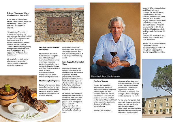 At the edge of the La Clape Natural Park, Château l’Hospitalet is not merely a resort—it is Bertrand’s universe made tangible.