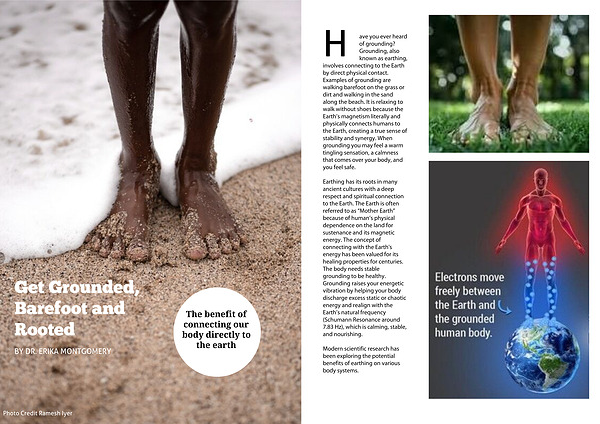 known as earthing, involves connecting to the Earth by direct physical contact. Examples of grounding are walking barefoot on the grass or dirt and walking in the sand along the beach. It is relaxing to walk without shoes because the Earth’s magnetism literally and physically connects humans to the Earth, creating a true sense of stability and synergy. When grounding you may feel a warm tingling sensation, a calmness that comes over your body, and you feel safe.