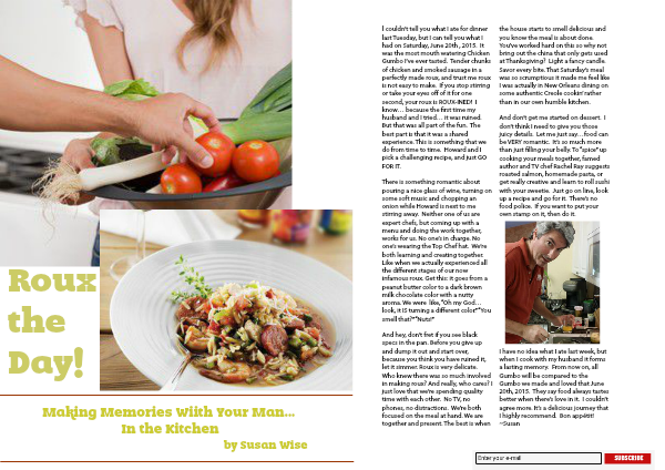 I have no idea what I ate last week, but when I cook with my husband it forms a lasting memory. From now on, all Gumbo will be compared to the Gumbo we made and loved that June 20th, 2015. They say food always tastes better when there’s love in it. I couldn’t agree more. It’s a delicious journey that I highly recommend. Bon appétit! ~Susan