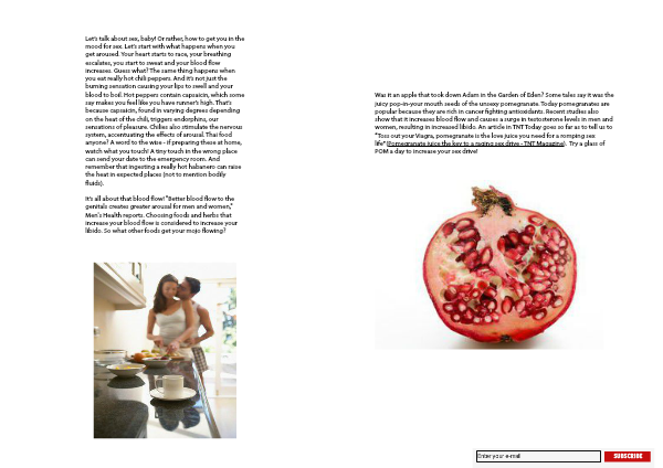 Was it an apple that took down Adam in the Garden of Eden? Some tales say it was the juicy pop-in-your mouth seeds of the unsexy pomegranate. Today pomegranates are popular because they are rich in cancer fighting antioxidants. Recent studies also show that it increases blood flow and causes a surge in testosterone levels in men and women, resulting in increased libido. An article in TNT Today goes so far as to tell us to “Toss out your Viagra, pomegranate is the love juice you need for a romping sex life” (Pomegranate juice the key to a raging sex drive - TNT Magazine). Try a glass of POM a day to increase your sex drive!