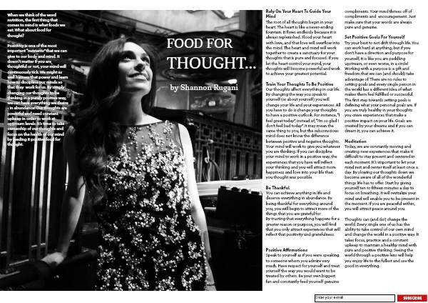 Positivity is one of the most important “nutrients” that we can give to our body and mind. It doesn't matter if you are thoughtful or not, your mind will continuously tick. We might as well harness that power and learn how to discipline our minds so that they work for us. By simply changing our thoughts to be thinking in a purely positive way, we can have everything we desire - in abundance! Our thoughts are powerful and need constant upkeep in order to work at optimum levels. It’s time to take ownership of our thoughts and focus on the health of our mind by feeding it positive food for thought.
