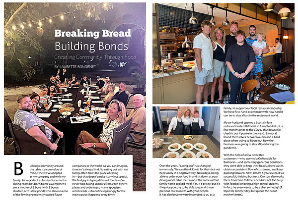 at my company and with my family. As important as family dinner in the dining room has been to me as a mother; I am a mother of 5 boys (with 3 bonus children across the pond) who also runs one of the few independently owned flavor companies in the world. As you can imagine, time isn’t always kind. So eating out with my family often takes the place of eating in—but that doesn’t make it any less special. We find joy in trying different foods we’ve never had, taking samples from each other's plates and ordering so many appetizers which leads us to not being hungry for the main course (happens every time).