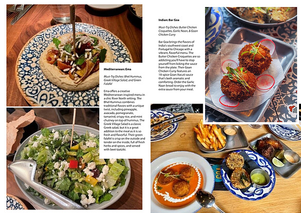 Ema offers a creative Mediterranean-inspired menu in a chic River North setting. The Bhel Hummus combines traditional flavors with a unique twist, including pineapple, avocado, pomegranate, tamarind, crispy rice, and mint chutney on top of hummus. The Greek Village Salad is a classic Greek salad, but it is a great addition to the meal as it is so fresh and flavorful. Their green falafel is crisp on the outside and tender on the inside, full of fresh herbs and spices, and served with beet tzatziki.