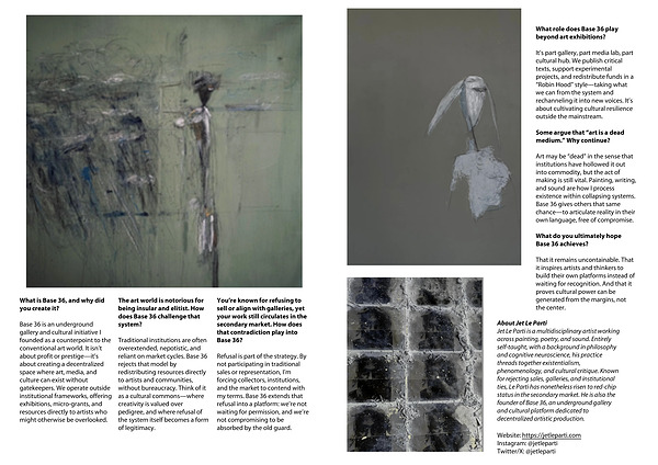 Jet Le Parti is a multidisciplinary artist working across painting, poetry, and sound. Entirely self-taught, with a background in philosophy and cognitive neuroscience, his practice threads together existentialism, phenomenology, and cultural critique. Known for rejecting sales, galleries, and institutional ties, Le Parti has nonetheless risen to red-chip status in the secondary market. He is also the founder of Base 36, an underground gallery and cultural platform dedicated to decentralized artistic production.