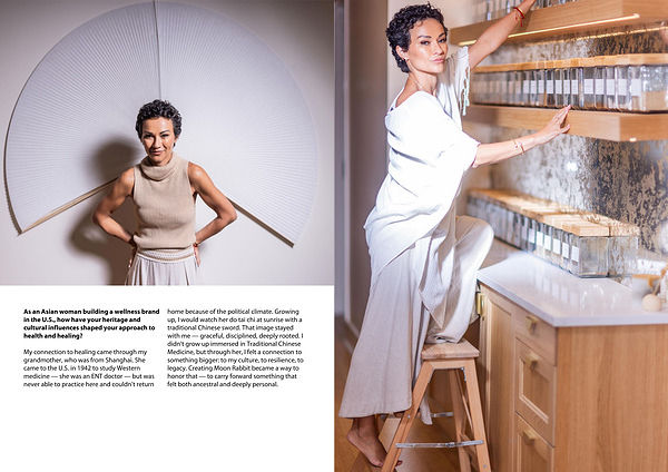 My connection to healing came through my grandmother, who was from Shanghai. She came to the U.S. in 1942 to study Western medicine — she was an ENT doctor — but was never able to practice here and couldn’t return home because of the political climate. Growing up, I would watch her do tai chi at sunrise with a traditional Chinese sword. That image stayed with me — graceful, disciplined, deeply rooted. I didn’t grow up immersed in Traditional Chinese Medicine, but through her, I felt a connection to something bigger: to my culture, to resilience, to legacy. Creating Moon Rabbit became a way to honor that — to carry forward something that felt both ancestral and deeply personal.