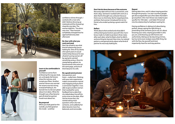Having confidence in dating isn't about being perfect, always saying the right thing or pretending to be someone you're not. It’s about knowing your value, staying grounded in who you are, and showing up with honest and authenticity. Dating can be daunting at times, but try not to over analyze every little thing. Go with the flow, be yourself and most importantly-have fun and stay positive.
