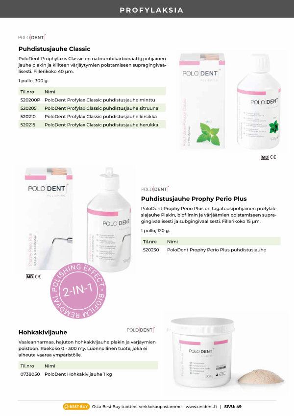 PoloDent Prophy Perio Plus on tagatoosipohjainen profylaksiajauhe Plakin, biofilmin ja värjäämien poistamiseen supragingivaalisesti ja subgingivaalisesti. Fillerikoko 15 µ m.