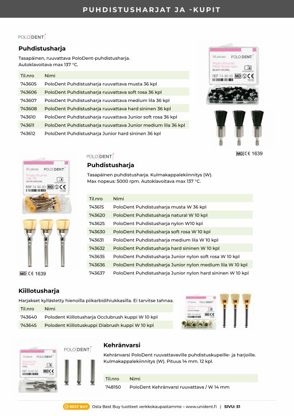743607 PoloDent Puhdistusharja ruuvattava medium lila 36 kpl 743608 PoloDent Puhdistusharja ruuvattava hard sininen 36 kpl 743610 PoloDent Puhdistusharja ruuvattava Junior soft rosa 36 kpl 743611 PoloDent Puhdistusharja ruuvattava Junior medium lila 36 kpl 743612 PoloDent Puhdistusharja Junior hard sininen 36 kpl