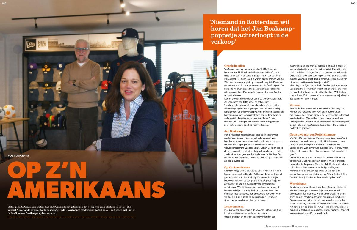 Oranje hoodies Via Marcel van der Kraan , sportchef bij De Telegraaf , hoorden Pim Blokland – wie Feyenoord liefheeft , kent deze suikeroom – en Laurain Engel-Te Riet dat de dove stervoetballers in een jaar tijd waren opgeklommen van de 21e naar de zevende plek op de wereldranglijst . Daarmee verzekerden ze zich van deelname aan de Deaflympics . De bond , de KNDSB , beschikte echter niet over voldoende middelen om het elftal inclusief begeleiding naar Brazilië te laten afreizen . Dat lot trokken de eigenaren van PLG Concepts zich aan . Ze bedachten een toffe actie : ze ontwierpen ‘ retailwaardige ’ oranje shirts en hoodies , ofwel kleding waarmee je tijdens Koningsdag en het WK voor de dag kunt komen . Door de verkoop van die shirts en hoodies én bijdragen van sponsors is deelname aan de Deaflympics veiliggesteld . Engel (‘ geen schoonfamilie van ’) doet namens PLG Concepts het woord : ‘ Dat het is gelukt in zo ’ n korte periode , geeft zó veel voldoening .’